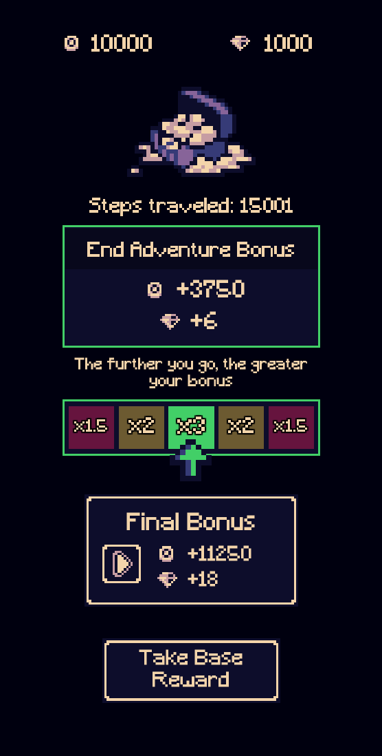 I’ve added a new way to help get your adventures to feel more rewarding. With every step, you will slowly building up an adventure bonus which rewards you with Coins and Diamonds after completing your adventure. This feature works for Hardcore as well and the final bonus is an optional rewarded ad to boost your base reward and will choose the multiplier that it is currently on. No ads are shown for those who are VIP 2+ or playing on the Steam version. Below is the current formula for adventure bonus, but keep in mind that fast traveling does not count towards the bonus.